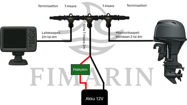 Johda kaapeli 12V akulle ja varmista, että akun ja NMEA 2000 järjestelmän plussa johdin kulkee pääkytkimen kautta. Mikäli NMEA 2000 järjestelmä kytketään virheellisesti suoraan akkuun, NMEA 2000 järjestelmä voi kuluttaa virtaa myös laitteiden ollessa lepotilassa. Pääkytkimellä vältetään tyhjentyneiden akkujen ongelmat. Virtakaapelissa tulee olla mukana sulake suojaamaan laitteita sekä järjestelmää. Fimarin virtahaaroittimessa sekä virtajohdossa on valmiiksi 5A sulake mukana suojaamaan järjestelmää.