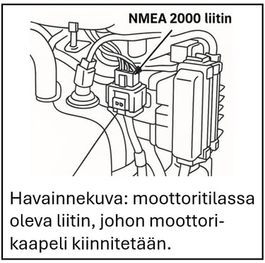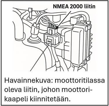 1.Avaa moottorikoppa ja etsi moottorin moottoritilasta NMEA liitin. Tarkista liittimen sijainti moottorisi käyttöohjeesta (BF40/50D s. 22, DBF60A s. 17, BF80/100A s 19, BF80/100Ak1 s. 18, BF115D s. 15)