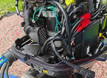 Liitä sarjan moottorikaapeli suoraan Tohatsu-moottorin diagnostiikkaporttiin. Diagnostiikkaportti sijaitsee tyypillisesti moottorin vasemmalla puolella. Vie kaapeli läpi moottorin läpivientikumista. Alla esimerkki Tohatsu 30D moottorin kytkemisestä. Liitin löytyy tyypillisesti moottorin vasemmalta puolelta.